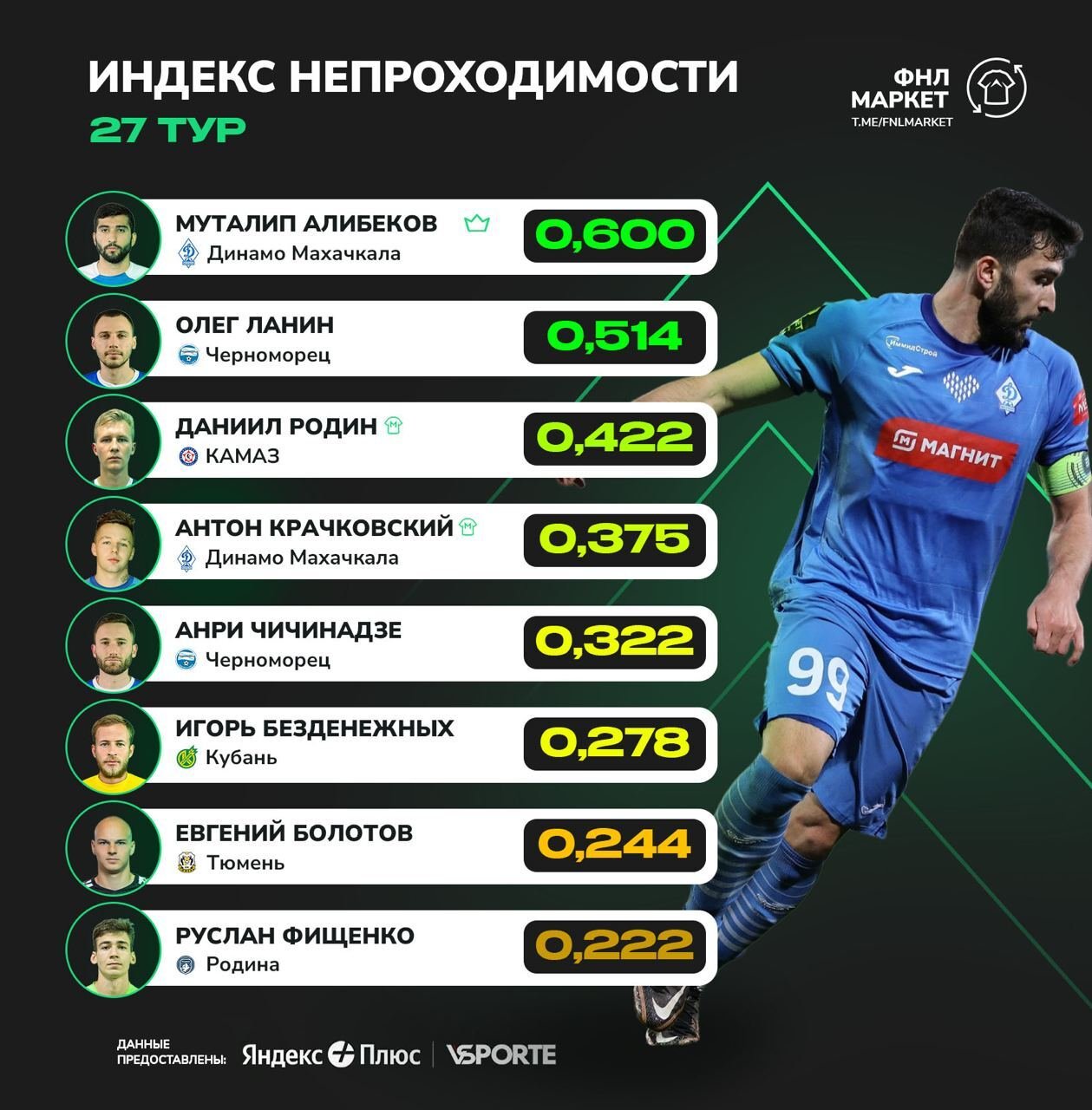 Игрок «Тюмени» вошёл в топ-8 футболистов по индексу непроходимости в 27-м туре Первой лиги