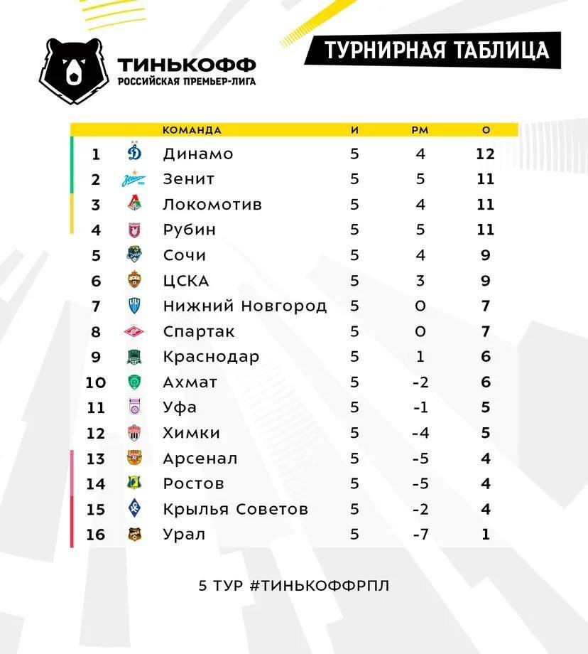 Завершился пятый тур чемпионата России по футболу. Лидирует с 12-ю очками московское «Динамо». Второе место с 11-ю очками делят сразу три команды — петербургский «Зенит», московский «Локомотив» и казанский «Рубин».