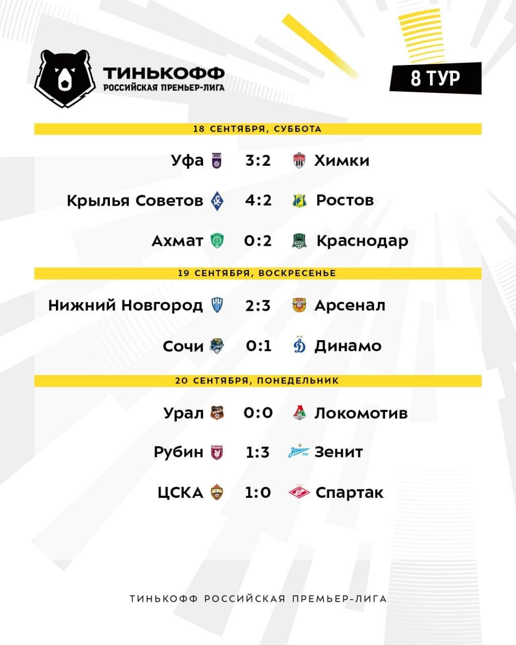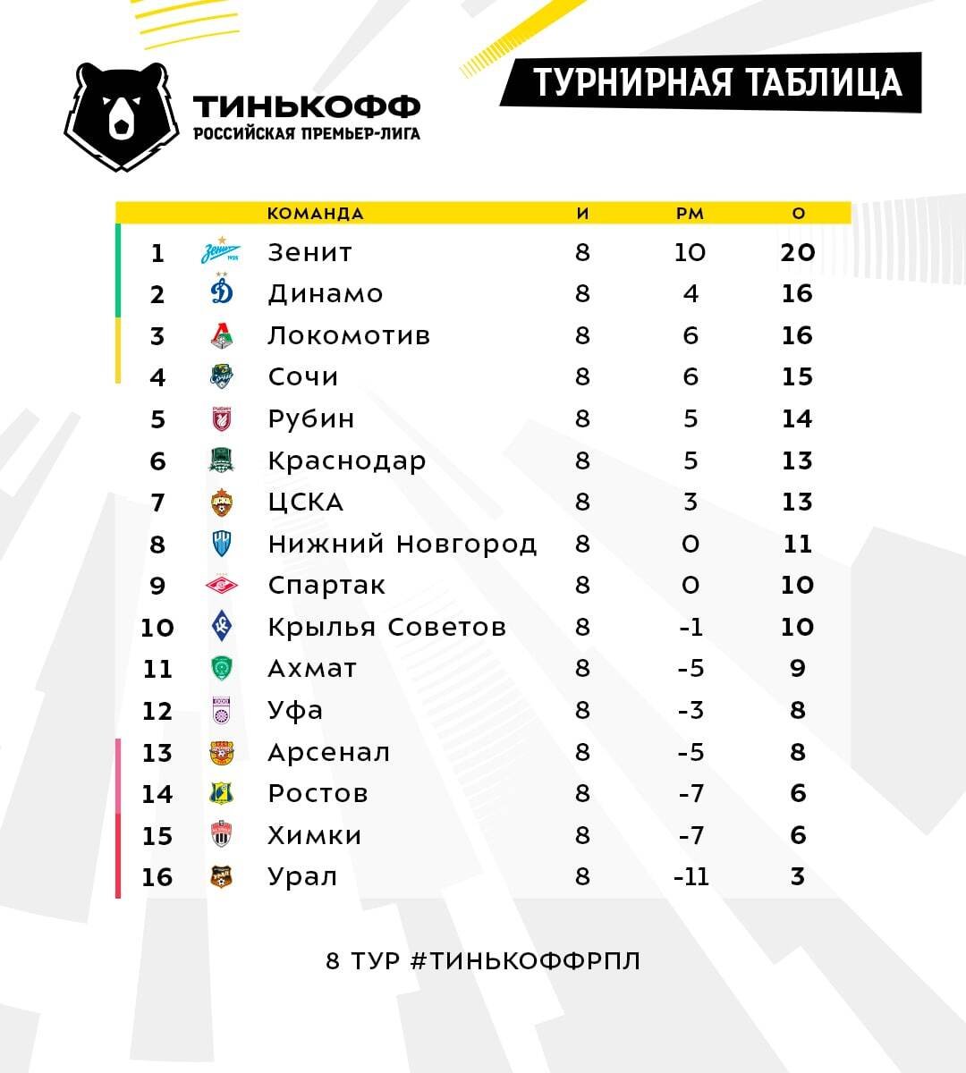 Завершился 8-й тур Российской премьер-лиги (РПЛ). Петербургский «Зенит» с 20-ю очками занимает первую строчку в таблице, «Динамо» и «Локомотив» имеют по 16 очков и располагаются на втором и третьем месте соответственно. В пятёрку лучших входят «Сочи» и «Рубин».