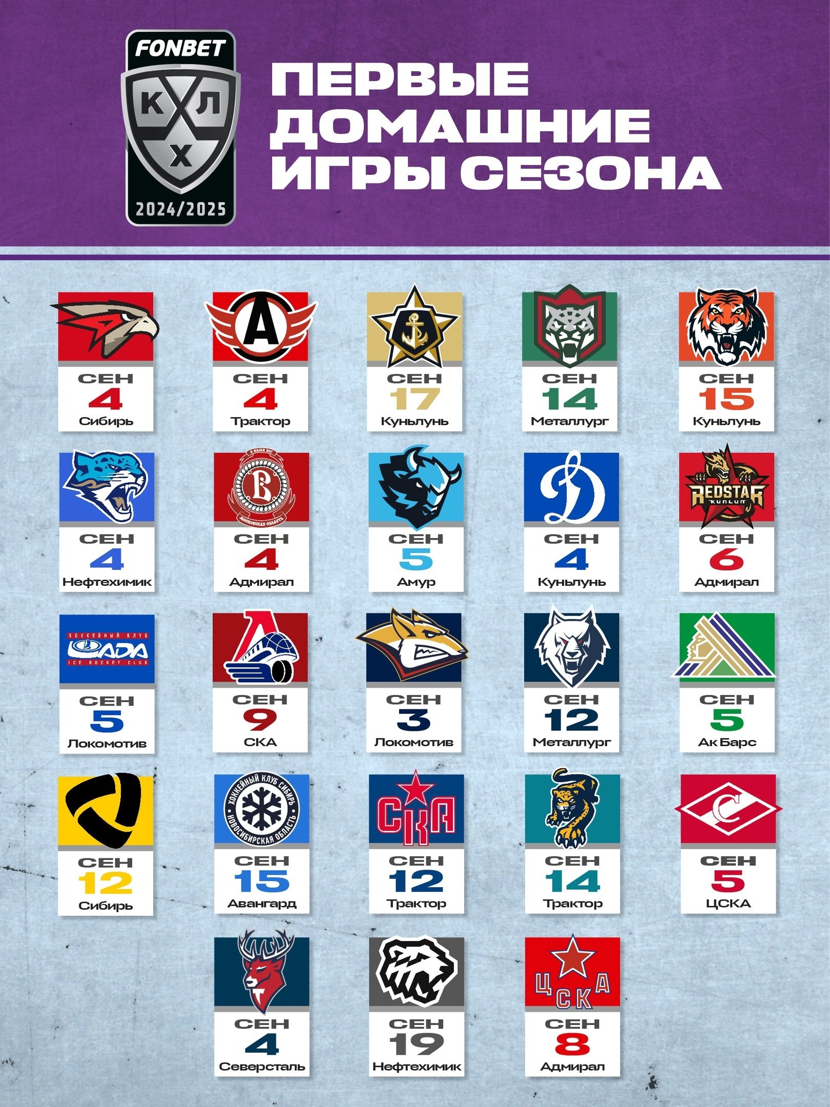 Пресс-служба Фонбет Континентальной хоккейной лиги (КХЛ) представила даты первых домашних матчей в новом сезоне-2024/2025.