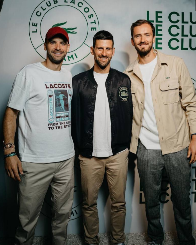 Сербский теннисист Новак Джокович опубликовал в соцсетях совместное фото с россиянином Даниилом Медведевым и болгарином Григором Димитровым. Спортсмены посетили мероприятие французского бренда Lacoste в Майами (США).