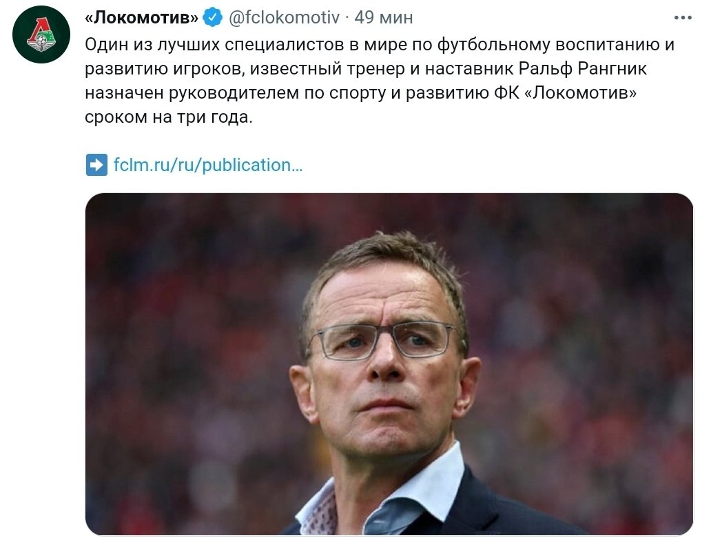 «Один из лучших специалистов в мире по футбольному воспитанию и развитию игроков, построению системы профессионального роста и мотивации для молодых футболистов, известный тренер и наставник Ральф Рангник назначен руководителем по спорту и развитию ФК «Локомотив» сроком на три года. Об этом на встрече с тренерским штабом, игроками и руководством клуба сообщил Председатель совета директоров ФК «Локомотив» Александр Плутник», – говорится в сообщении клуба.