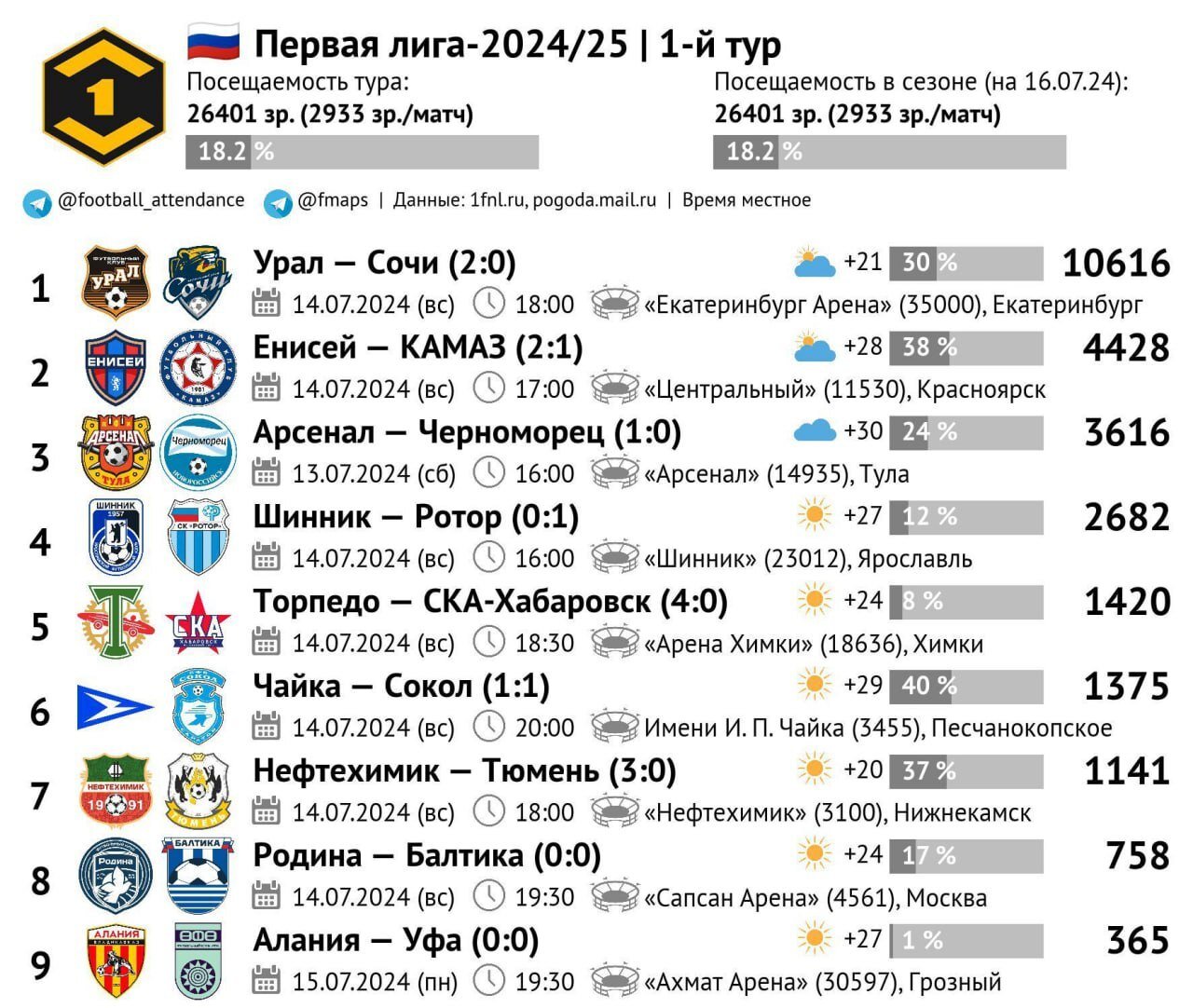 Матч тульского «Арсенала» с новороссийским «Черноморцем» (1:0) вошёл в тройку самых посещаемых в первом туре Мелбет-Первой лиги.