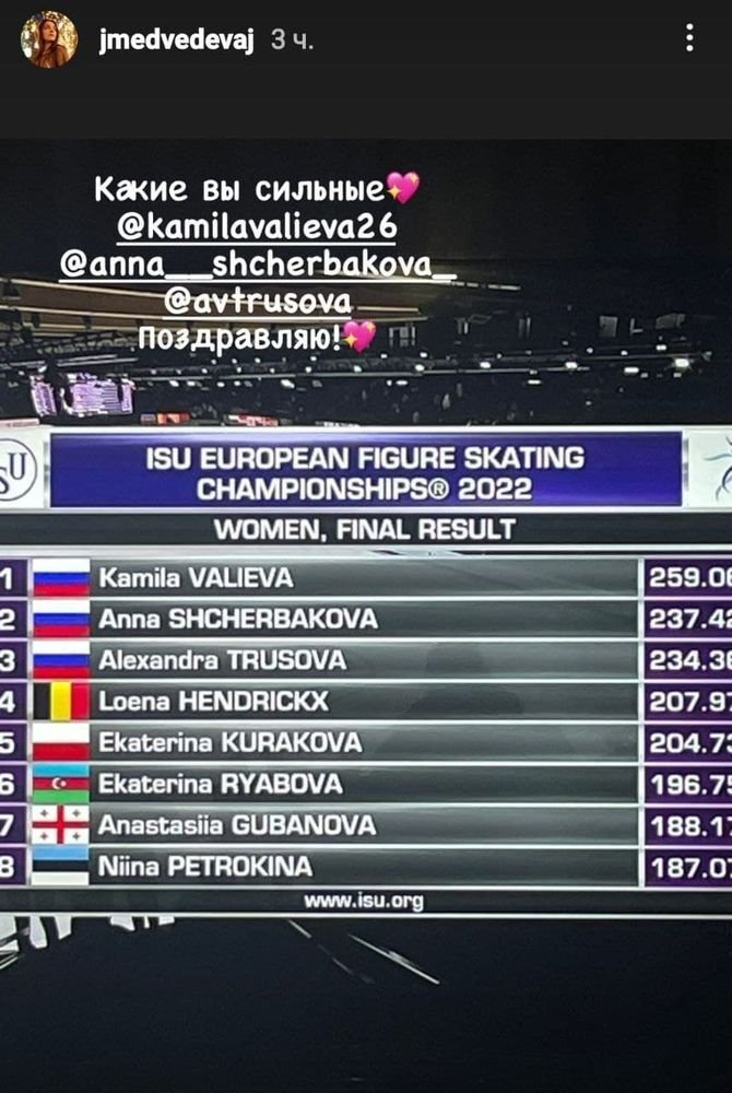 Медведева поздравила Валиеву, Щербакову и Трусову с медалями ЧЕ