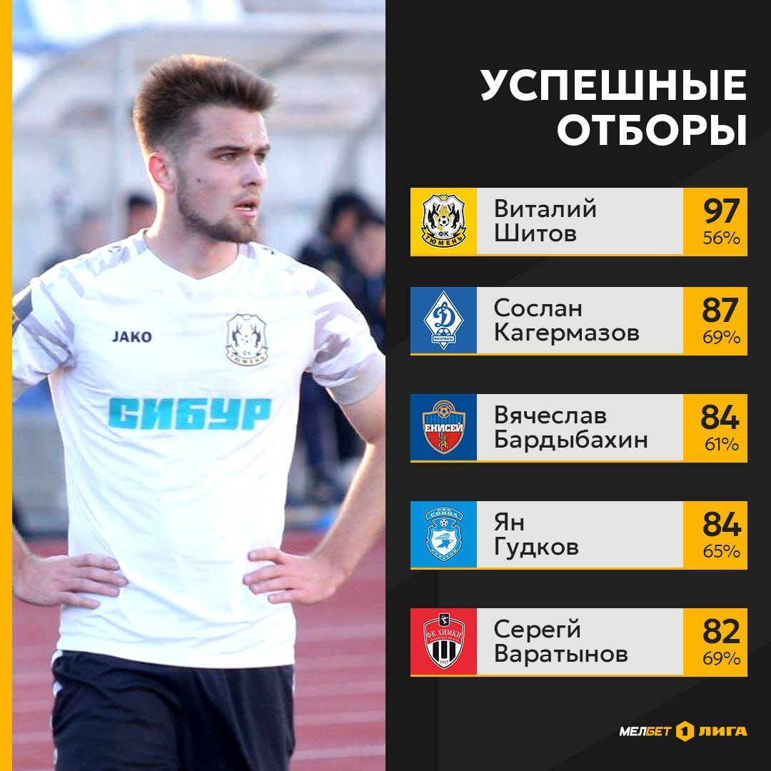 Вингер сибиряков 97 раз успешно отобрал мяч у соперников. Показатель эффективности Шитова в этом компоненте составил 56%. Нападающий «Тюмени» возглавил список лидеров по успешным отборам, опередив защитников других клубов.