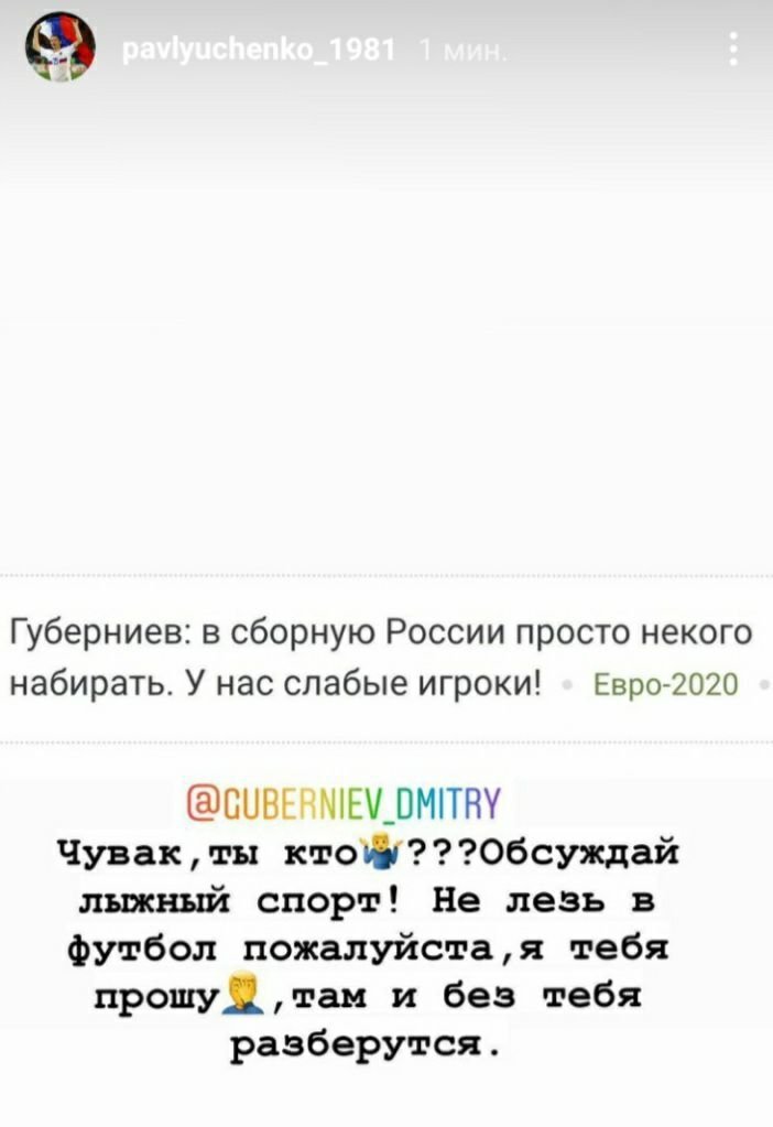 «Чувак, ты кто? Обсуждай лыжный спорт! Не лезь в футбол, пожалуйста, я тебя прошу. Там и без тебя разберутся», — написал Павлюченко.