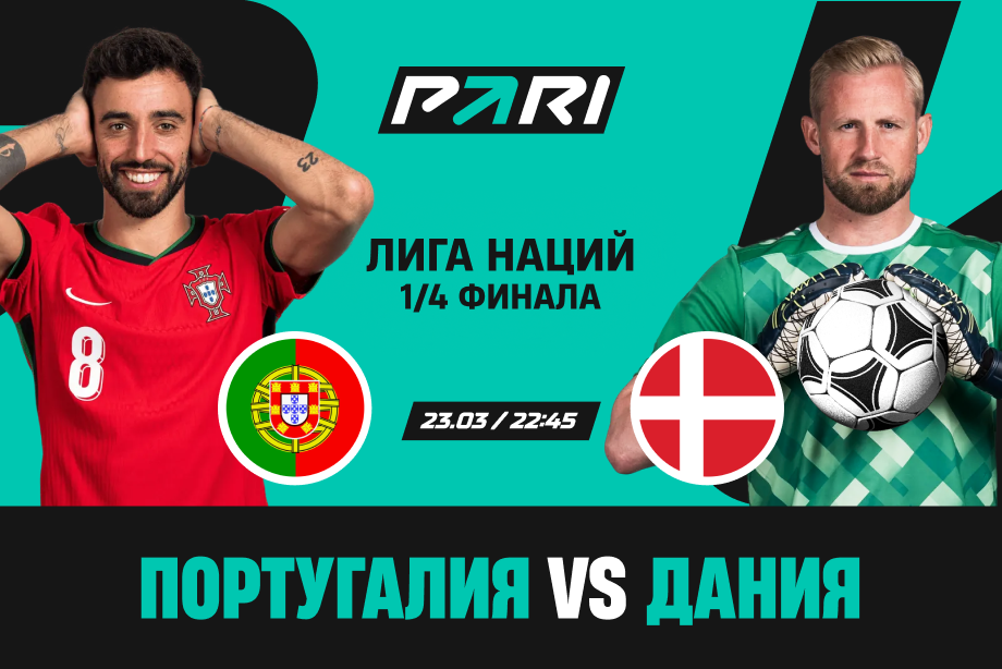 23 марта сборные Португалии и Дании встретятся в ответном матче 1/4 финала Лиги наций. Поединок пройдет в Лиссабоне и начнется в 22:45 по московскому времени. В первом матче датчане победили на своем поле — 1:0. Аналитики букмекерской компании PARI оценили шансы команд и рассказали о ставках клиентов на игру.