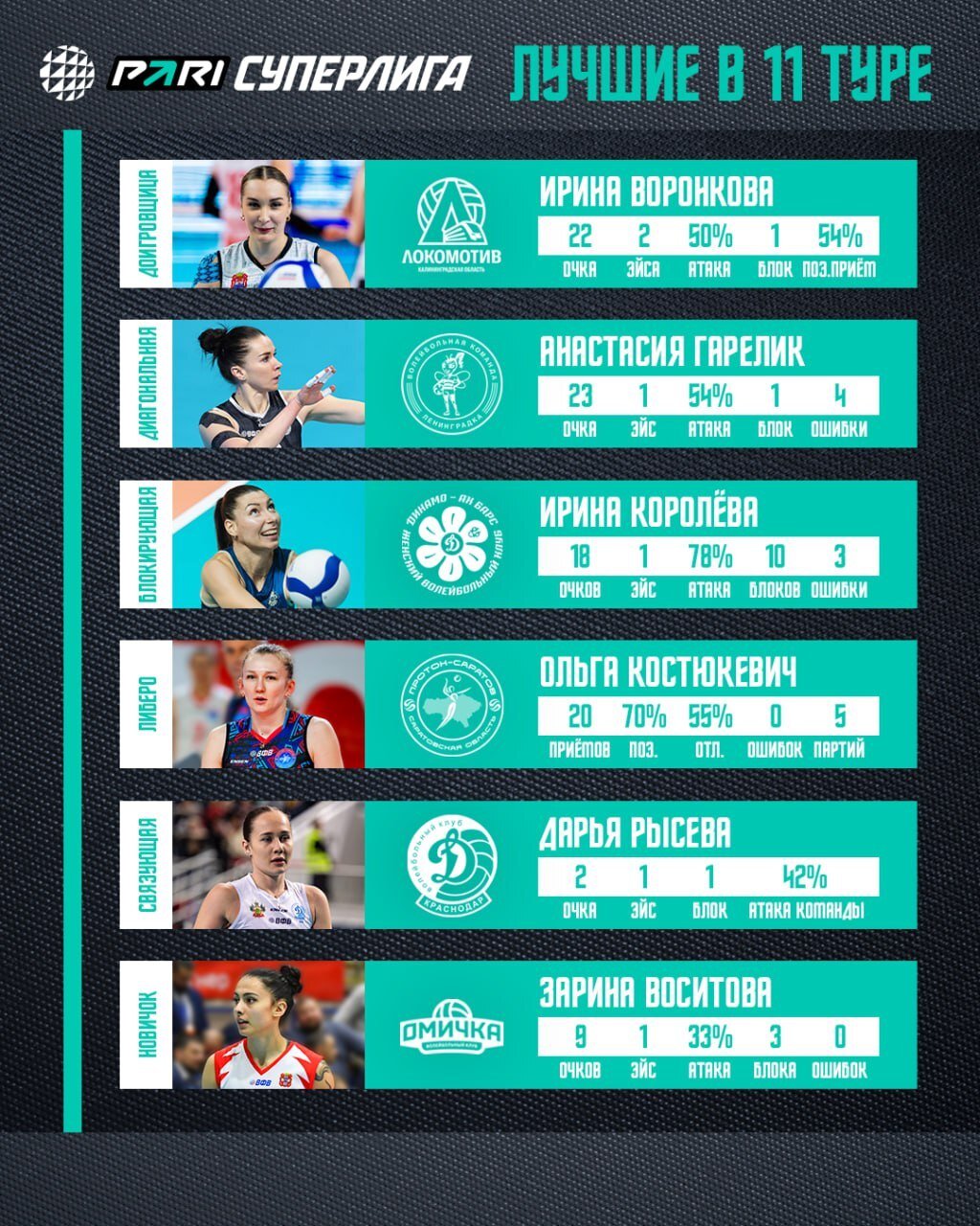 Пресс-служба женской Pari Суперлиги назвала имена лучших игроков 11-го тура.