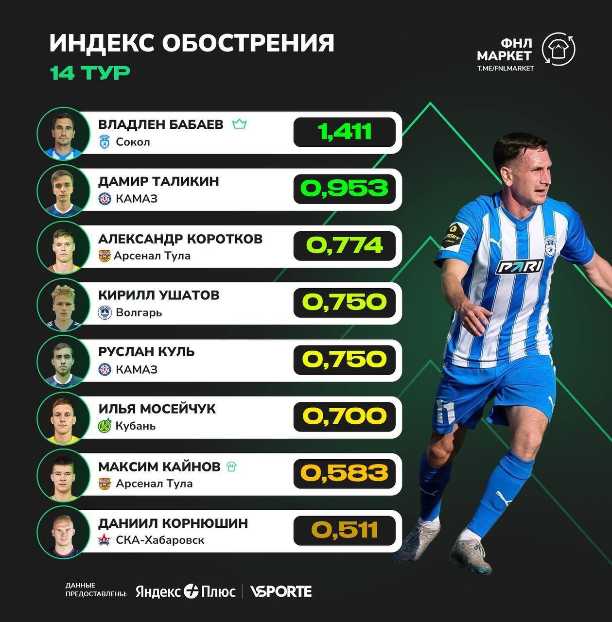 Полузащитник саратовского «Сокола» Владлен Бабаев возглавил рейтинг самых «обостряющих» футболистов 14-го тура Мелбет Первой лиги.