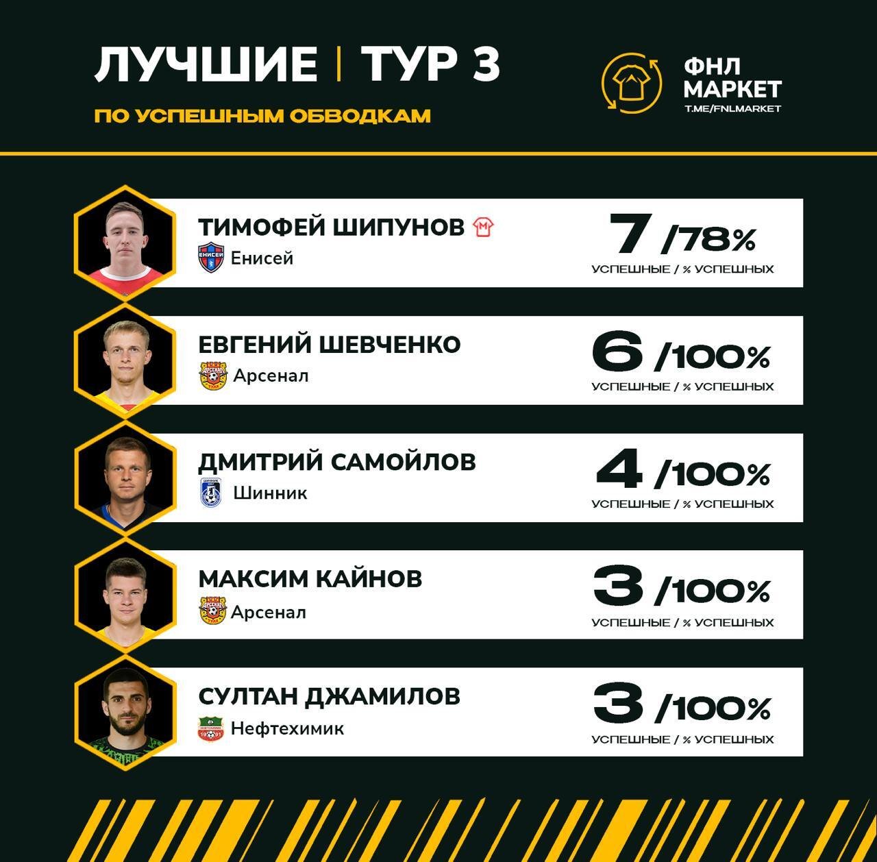Полузащитники тульского «Арсенала» Евгений Шевченко и Максим Кайнов вошли в список лучших игроков по успешным обводкам в 3-м туре Мелбет-Первой лиги.