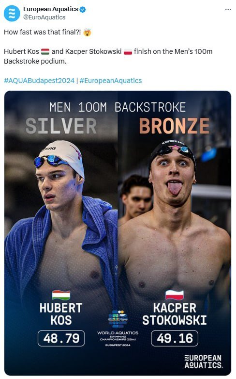 В своей публикации European Aquatics упомянула только двух спортсменов: венгра Хуберта Коша и поляка Кацпера Стоковски, которые завоевали серебряные и бронзовые медали.