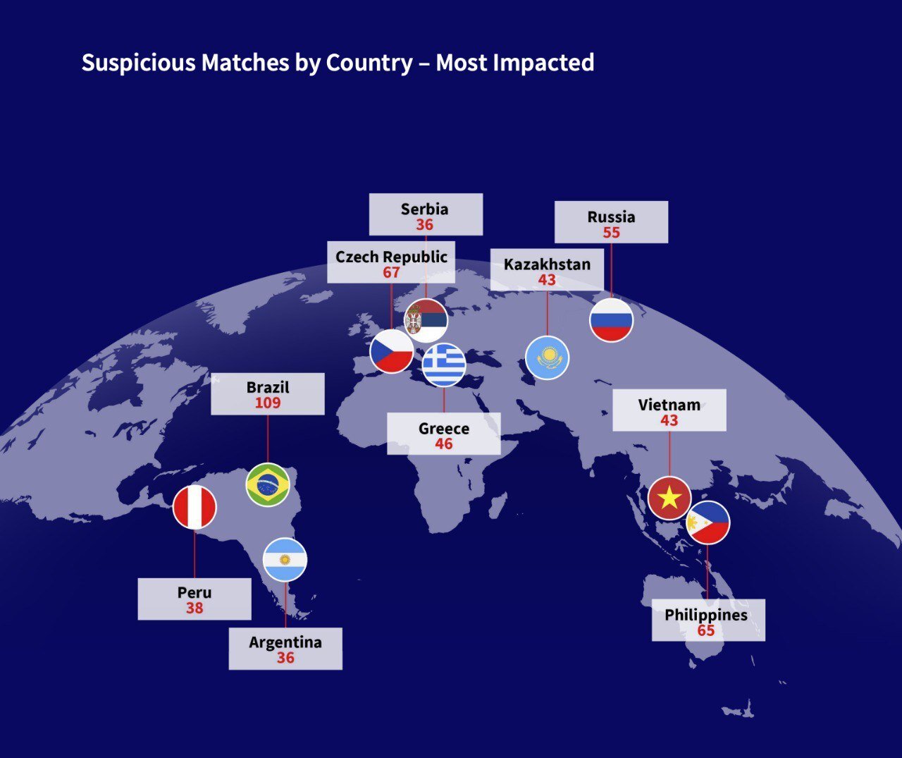 По данным исследования аналитической компании Sportradar, в прошлом году в России было выявлено 55 потенциально договорных событий.