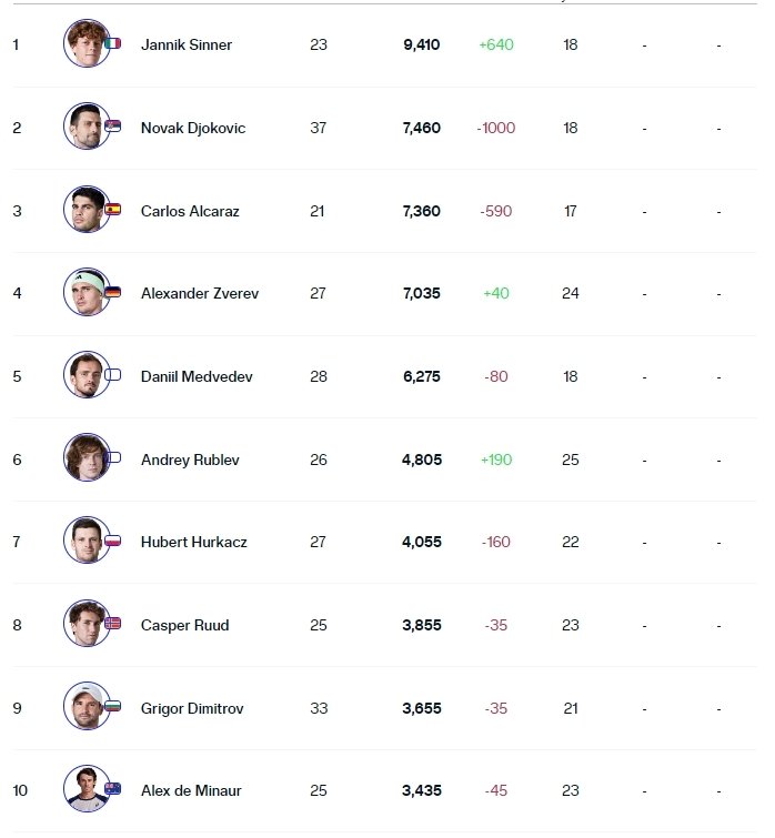 В первой десятке изменений не произошло. На первом месте — итальянец Янник Синнер (9410 очков). Второй — серб Новак Джокович (7460), третий — испанец Карлос Алькарас (7360).