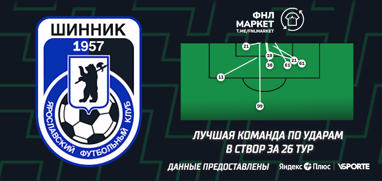 Ярославский «Шинник» стал лучшей командой по ударам в створ ворот в 26-м туре Мелбет Первой лиги. Об этом сообщает телеграм-канал ФНЛ Маркт.