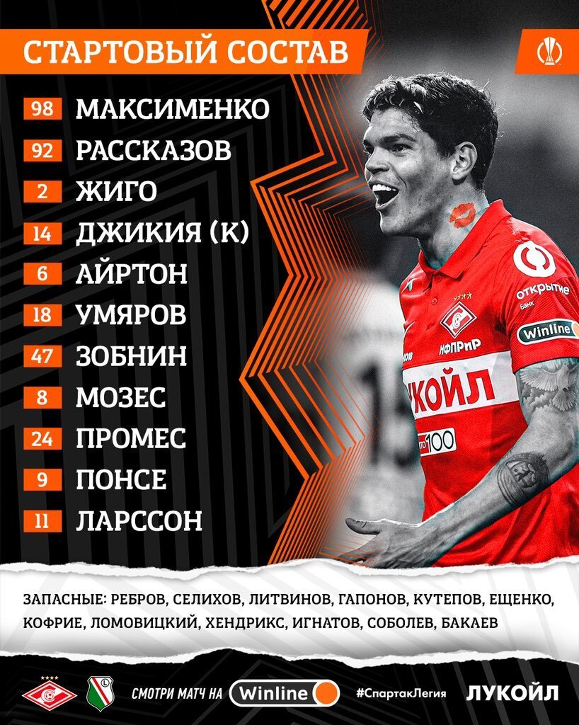 На сайте московского «Спартака» огласили стартовый состав на матч 1-го тура группового этапа Лиги Европы против польской «Легии».