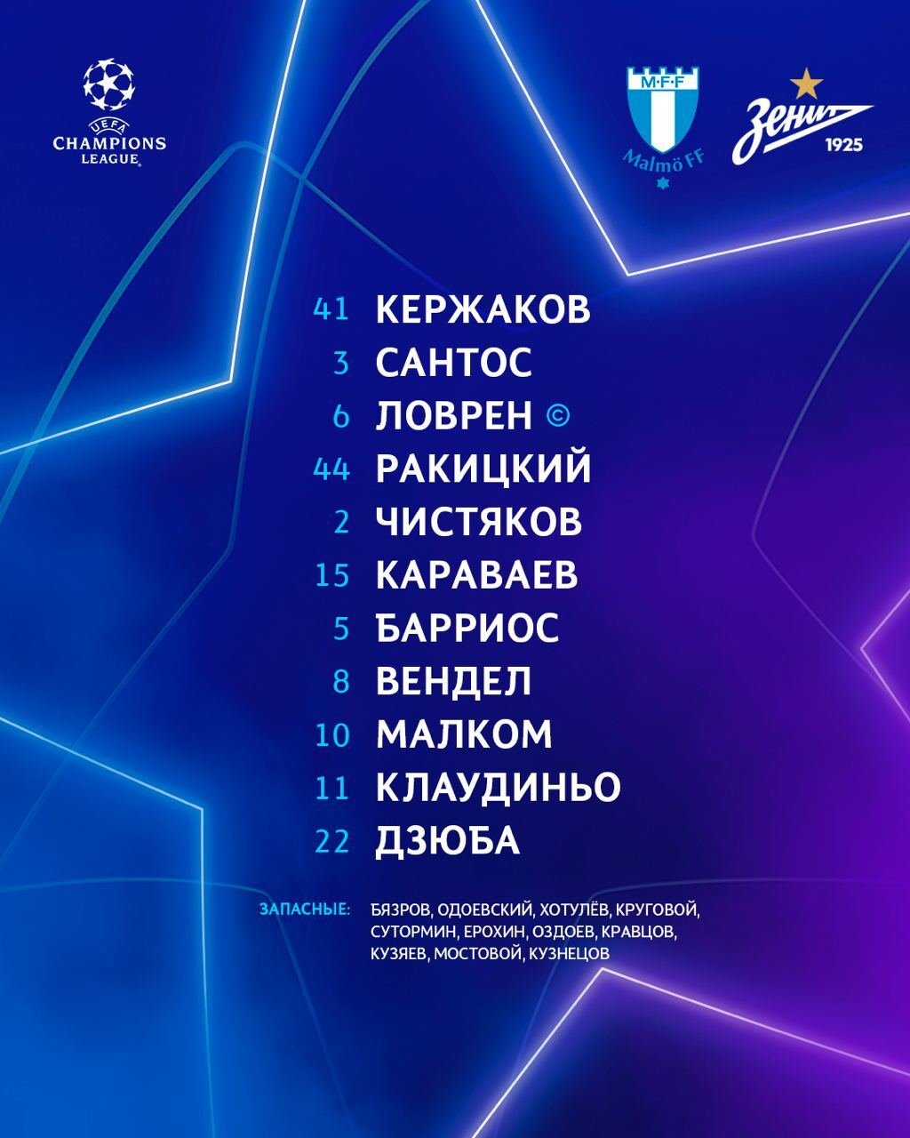 Петербургский «Зенит» огласил стартовый состав на матч пятого тура группового этапа Лиги чемпионов против «Мальмё». В воротах сыграет Михаил Кержаков, а с капитанской повязкой выйдет Деян Ловрен.