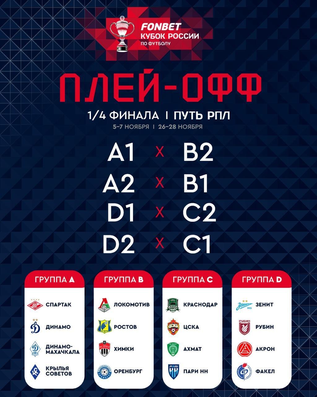 Российский футбольный союз (РФС) представил результаты жеребьёвки сетки 1/4 финала Пути РПЛ Фонбет Кубка России.