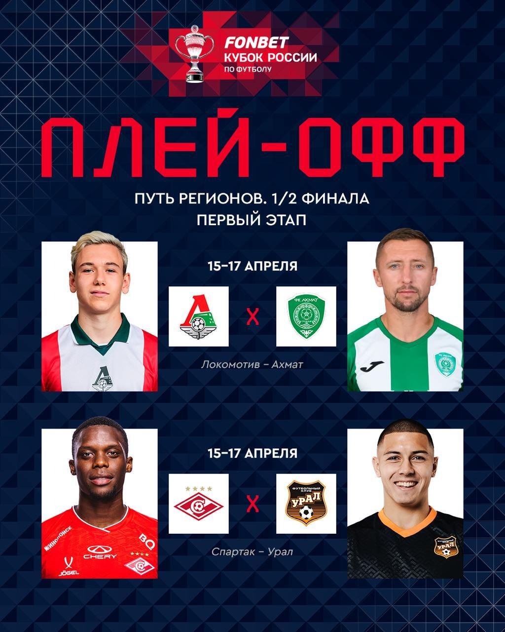 Московский «Локомотив» сыграет против грозненского «Ахмата», а столичный «Спартак» встретится с «Уралом». Матчи пройдут 15-17 апреля.