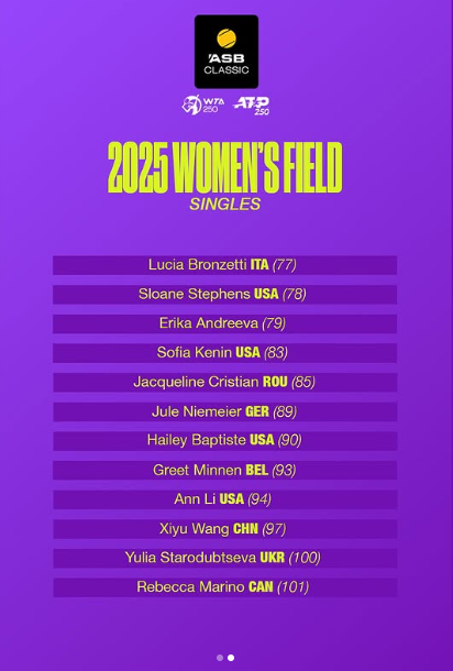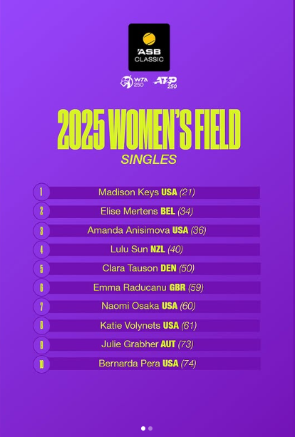 Также в турнире в Окленде сыграют Мэдисон Киз (21-е место в рейтинге WTA), Аманда Анисимова (36), Эмма Радукану (57), Наоми Осака (58), Кэти Волынец (59)
