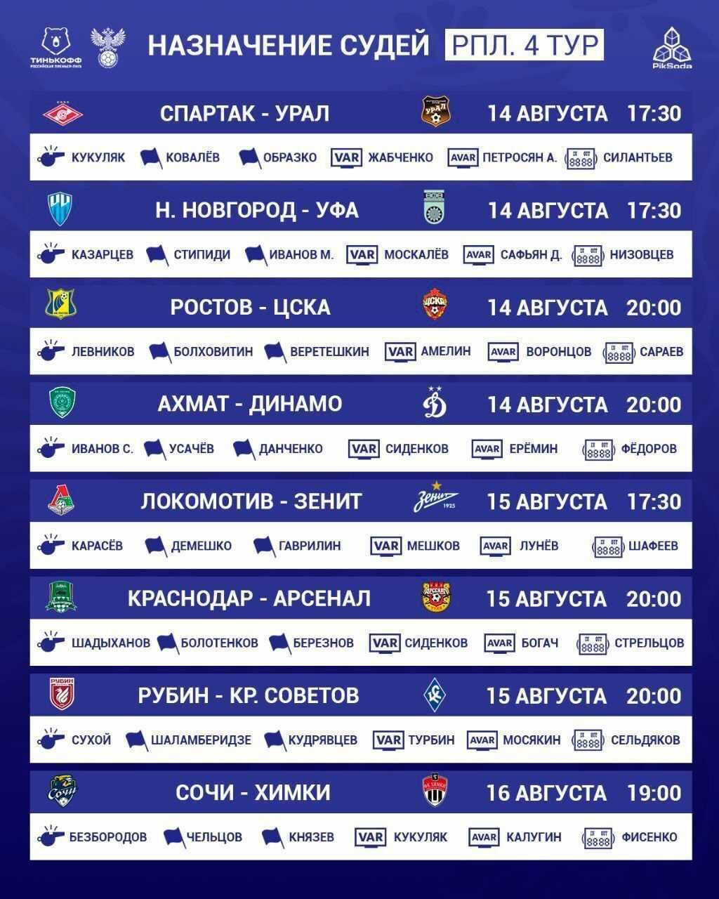 4-й тур Российской премьер-лиги (РПЛ) стартует 14 августа. Судить матчи будут следующие бригады арбитров:
