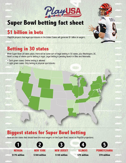 Невада, которая была вторым по величине рынком в 2021 году и исторически занимала первое место по прогнозам на Супербоул, может принести самую большую выручку в 2022 году — около 175 миллионов долларов. По другим штатам портал PlayUSA прогнозирует следующие данные: