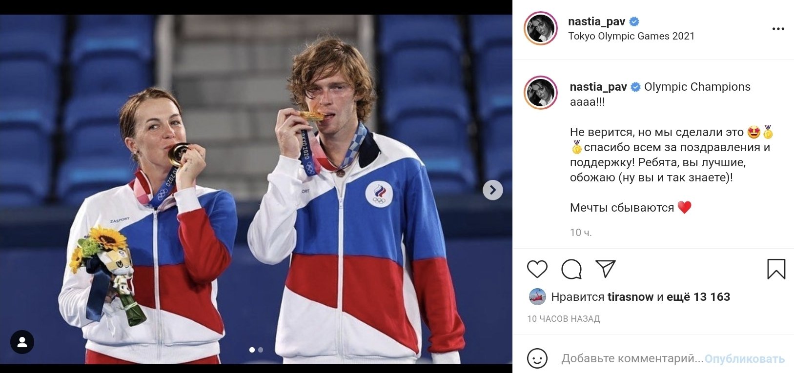 Российская теннисистка Анастасия Павлюченкова высказалась в своём «Инстаграме»* о победе в миксте теннисного турнира на Олимпийских играх в Токио. В финале она вместе с Андреем Рублёвым обыграла россиян Елену Веснину и Аслана Карацева. Встреча завершилась со счётом 6:3, 6:7 (5:7), 13:11.