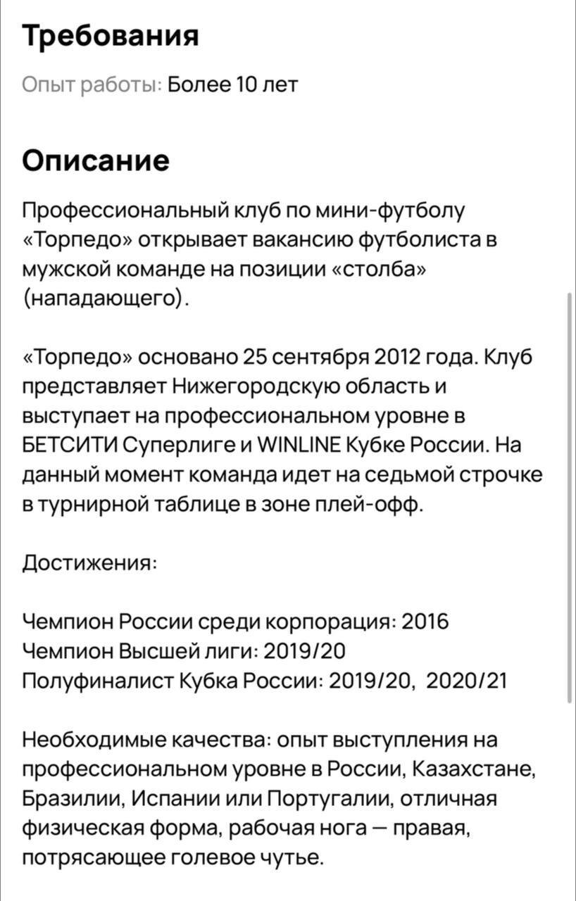 ПКМФ «Торпедо» из Нижнего Новгорода ищет футболиста на позицию нападающего через сайт объявлений.