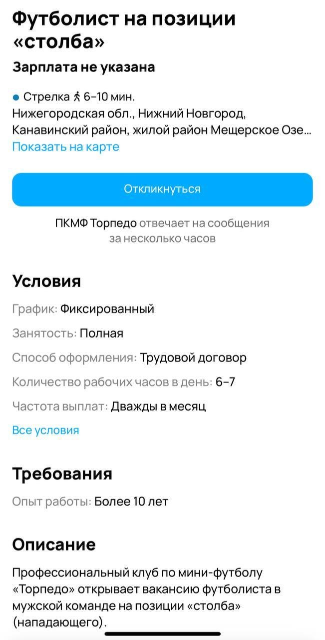 Как сообщил телеграм-канал «Мутко против», нижегородцы выложили вакансию на «Авито». Клубу требуется «футболист на позиции «столба». Среди требований — «отличная физическая форма и потрясающее голевое чутьё».