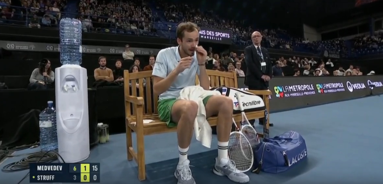 Во время матча 1/4 финала хардового турнира категории ATP-250 в Марселе (Франция) у восьмой ракетки мира российского теннисиста Даниила Медведева пошла кровь из носа из-за чего встреча была прервана.