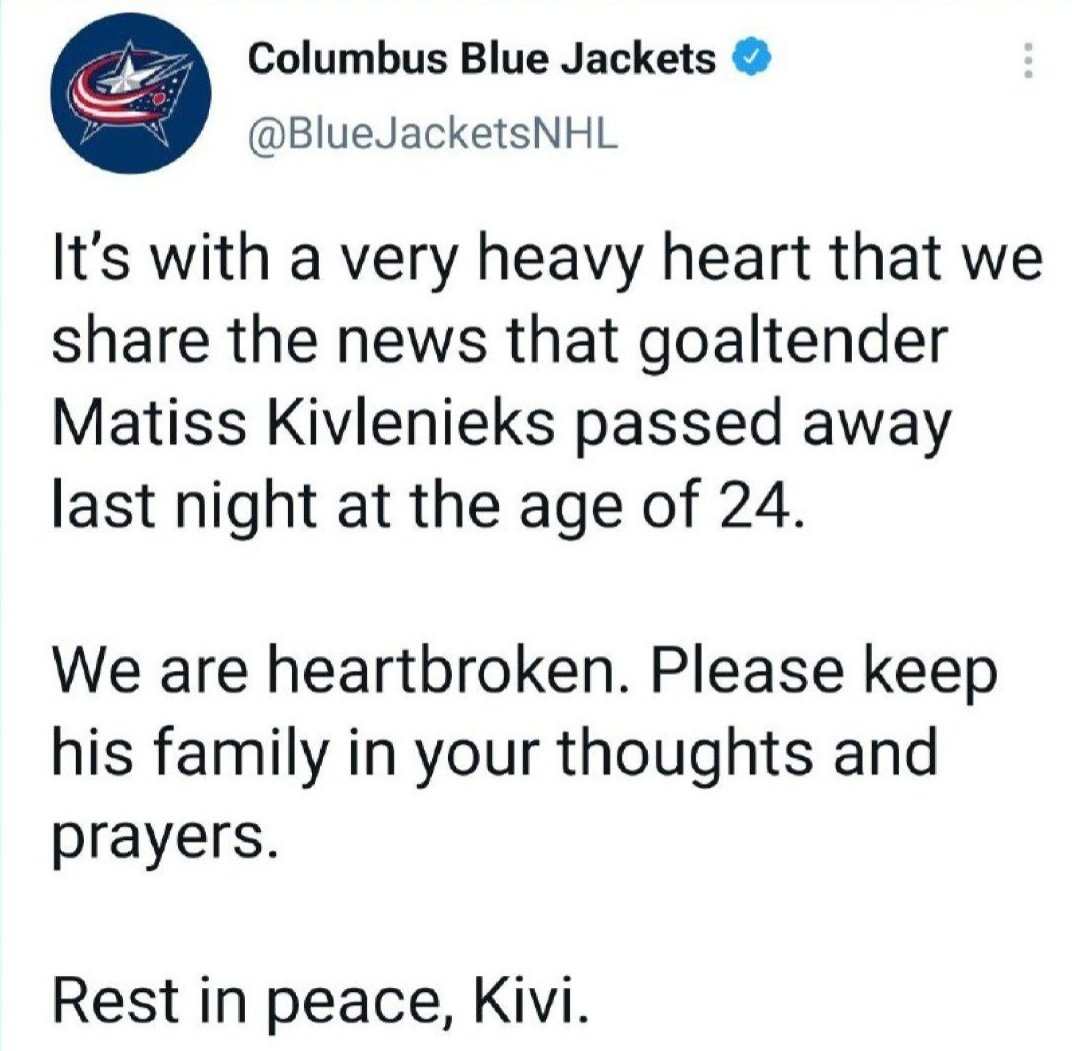 Федерация хоккея Латвии сообщила о смерти 24-летнего вратаря «Коламбус Блю Джекетс» и сборной страны Матисса Кивлениекса. Согласно заявлению клуба, причиной гибели молодого голкипера стала травма головы, которую он получил в результате несчастного случая.
