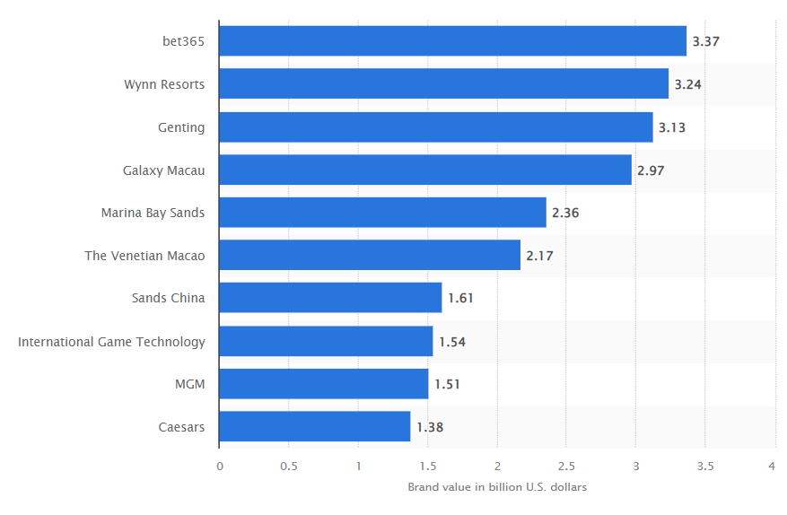 Портал Statista опубликовал рейтинг по стоимости бренда крупнейших представителей гемблинг-индустрии по итогам 2021 года. Лидером стала британская bet365 (3,371 миллиарда долларов), которая в 2020-м была в списке восьмой. Тройку замыкают американский гигант Wynn Resorts (3,238 миллиарда) и малайзийская Genting (3,13 миллиарда).