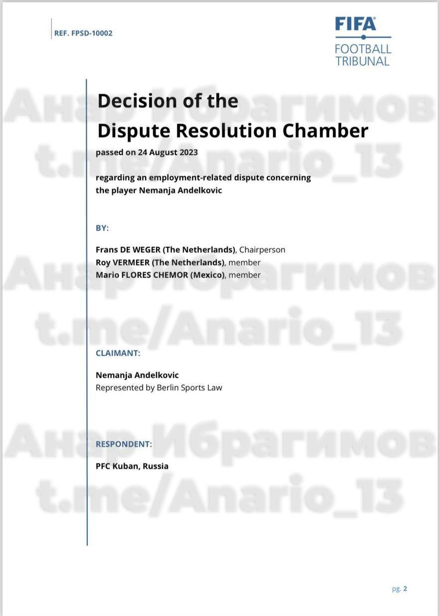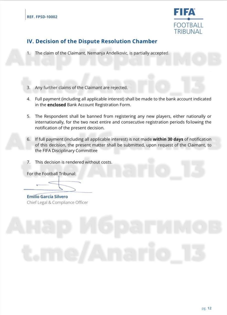 В пункте 5 документа указано: «ответчику запрещено регистрировать новых футболистов на национальном и международном уровнях в течение двух следующих полных периодов регистрации после уведомления о настоящем решении».