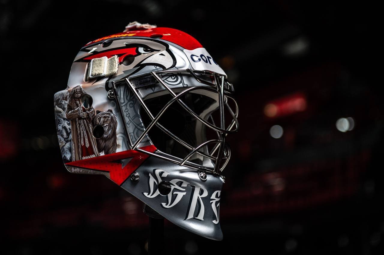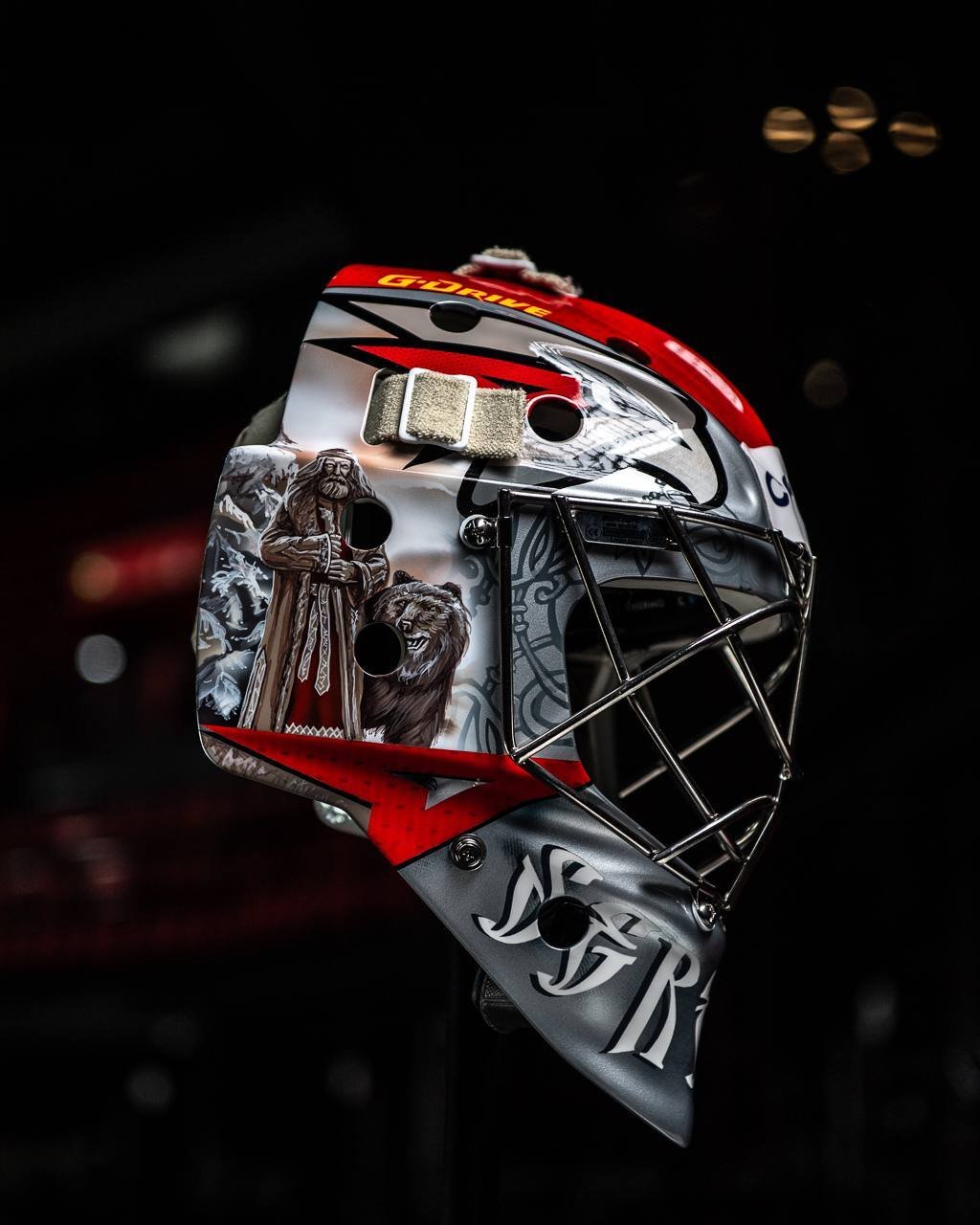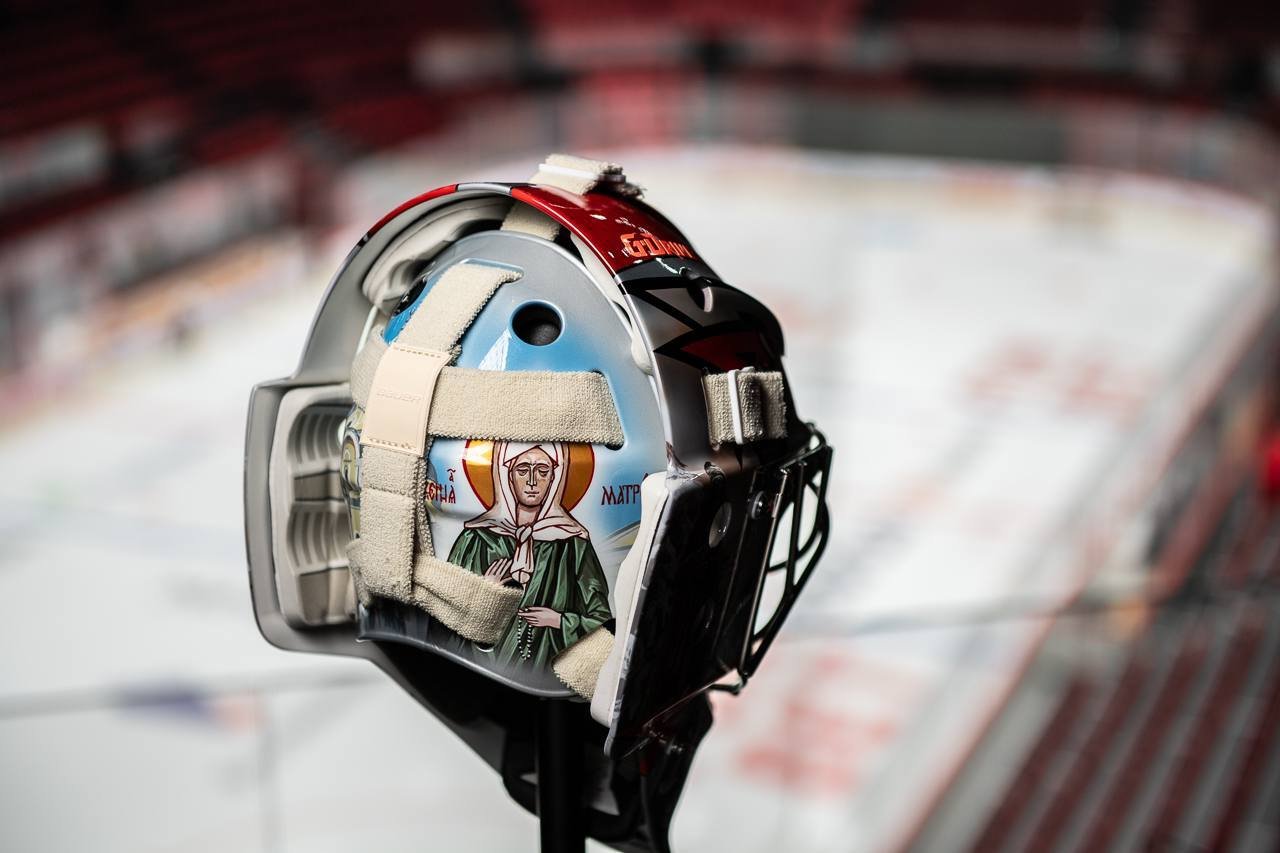 Вратарь «Авангарда» Серебряков показал новый шлем с изображениями Матроны Московской и языческих богов