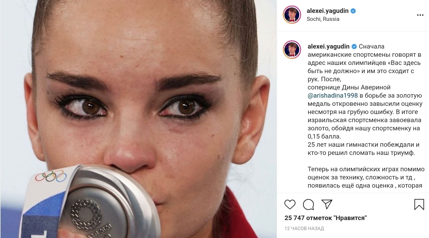 Олимпийский чемпион по фигурному катанию Алексей Ягудин прокомментировал выступление гимнастки Дины Авериной в личном многоборье на Олимпийских играх-2020 в Токио, где россиянка взяла серебро, а золото досталось Линой Ашрам из Израиля, которая в своей программе уронила ленту на ковёр.