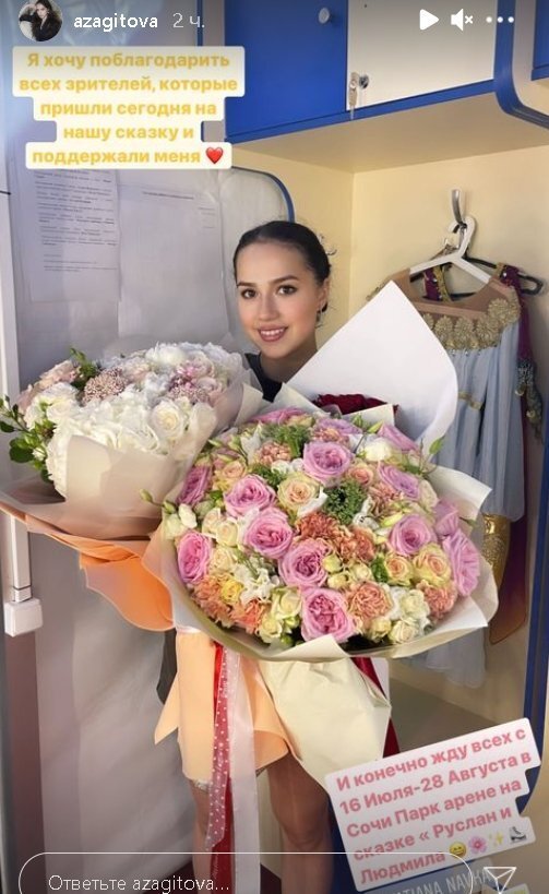 Шоу «Руслан и Людмила» пройдёт в Сочи с 1 июля по 30 сентября. Роль Людмилы также исполняют Аделина Сотникова и Татьяна Навка. Алина будет участвовать в шоу до конца августа.