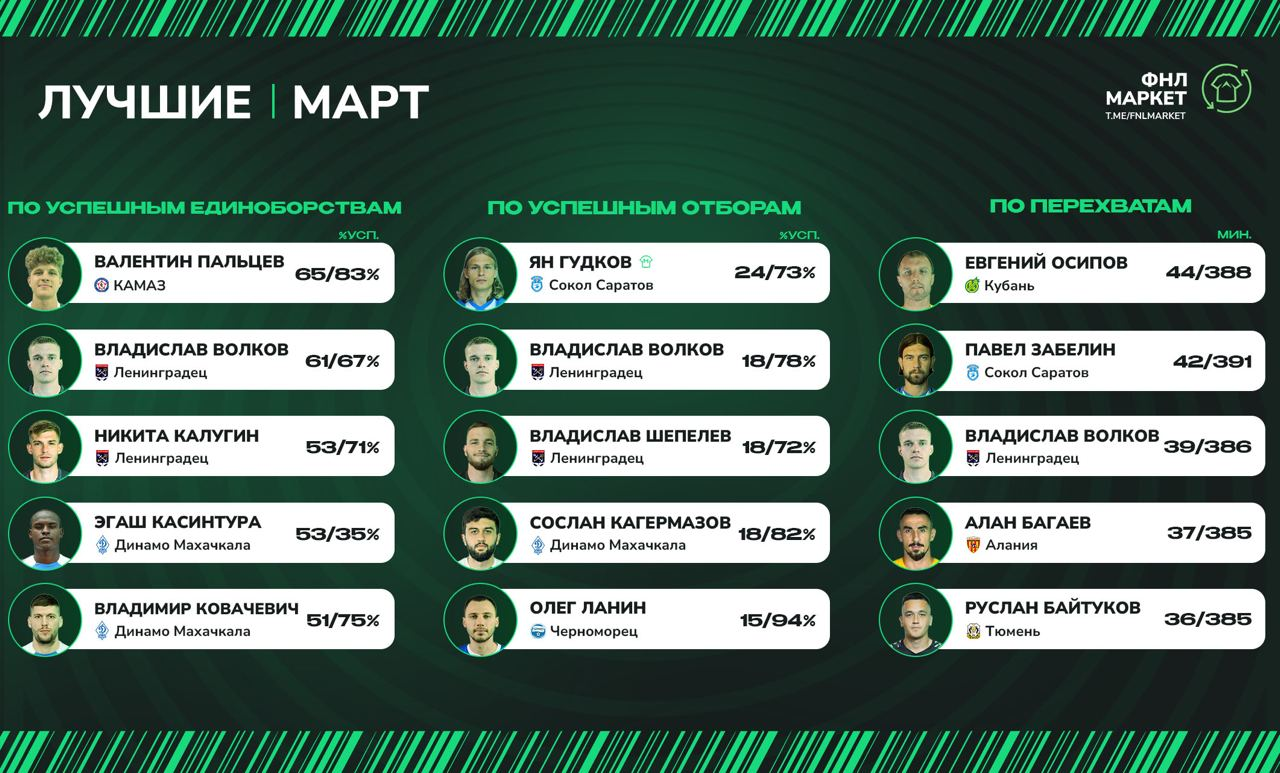Защитник «Тюмени» Руслан Байтуков вошёл в число лучших игроков Мелбет Первой лиги за март по перехватам.