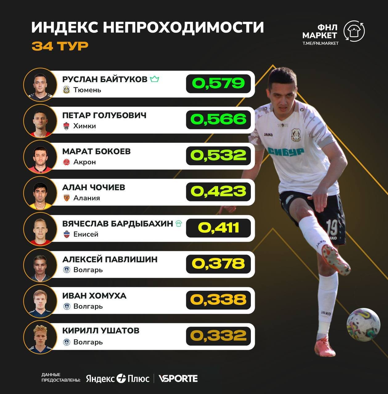 В заключительном туре чемпионата сибиряки уступили «Енисею» на выезде со счётом 0:2. Байтуков провёл на поле все 90 минут. Защитник тюменского клуба набрал 0,579 балла по индексу непроходимости, на 0,013 балла опередив Петара Голубовича из «Химок».