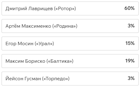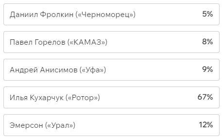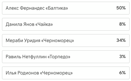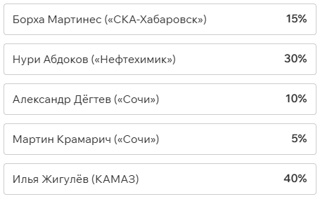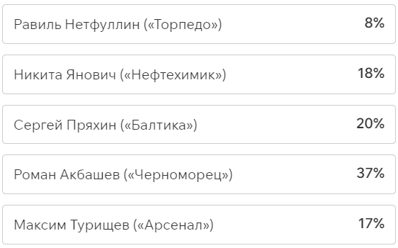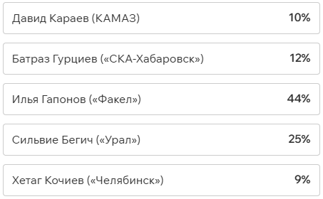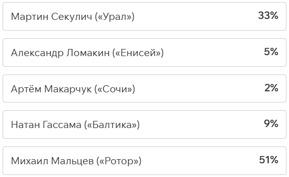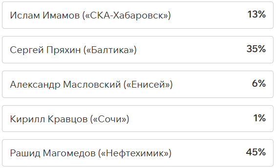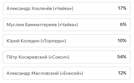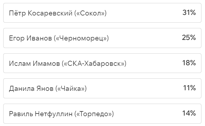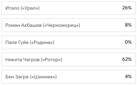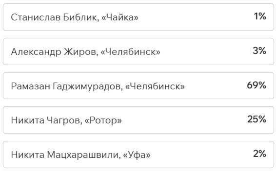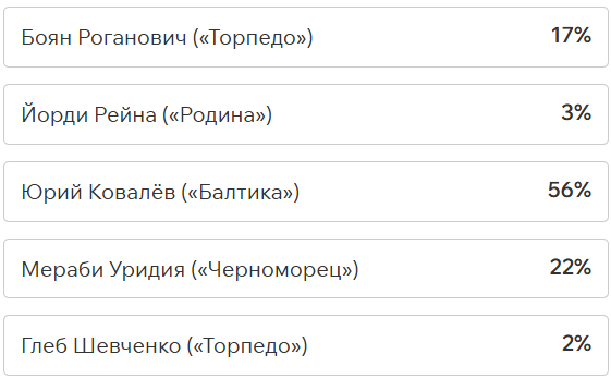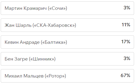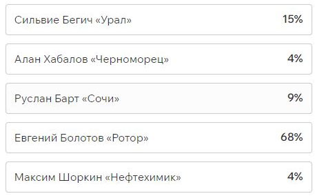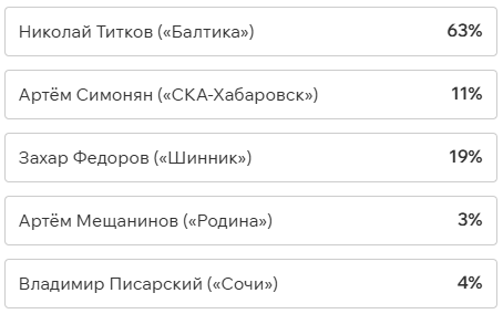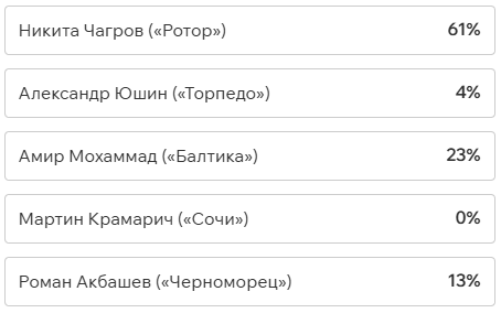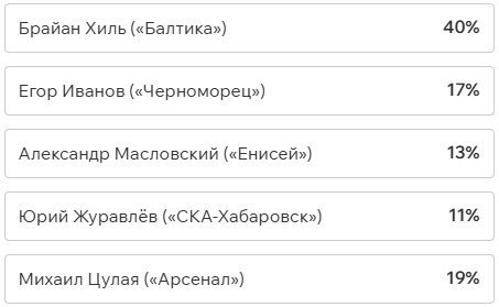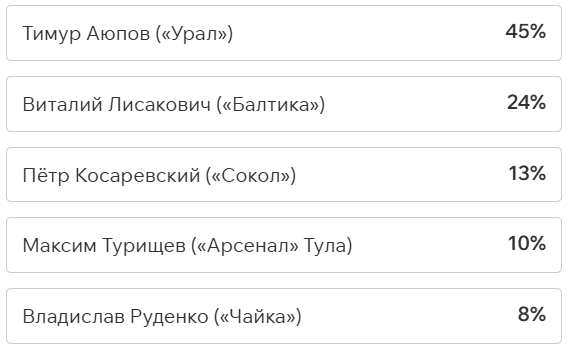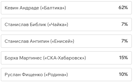 Игроки и тренеры команд ФНЛ подарили каждому кандидату по одному голосу (всего их 36, одна из команд отказалась от участия в голосовании). Мартин Крамарич получил 15 голосов, Кевин Андраде («Балтика») — 10, Роман Акбашев («Черноморец») — 9.