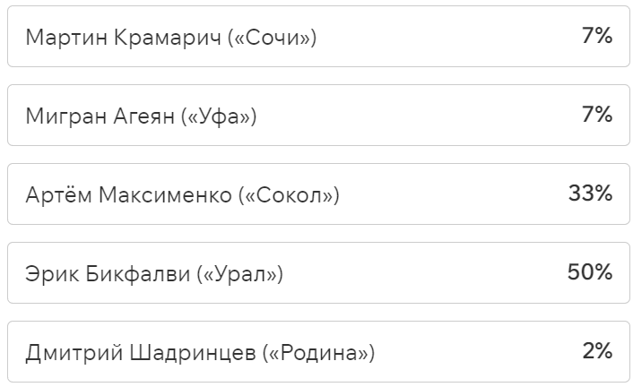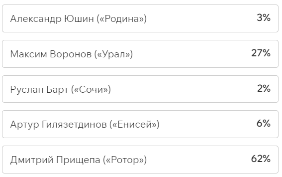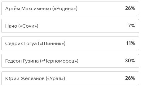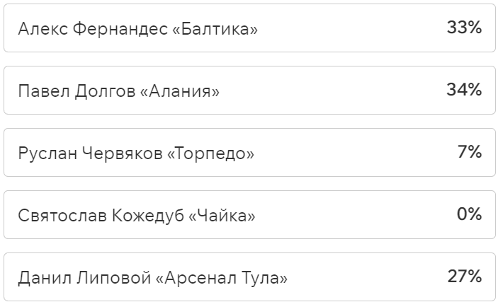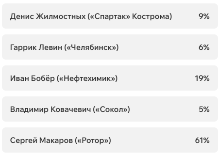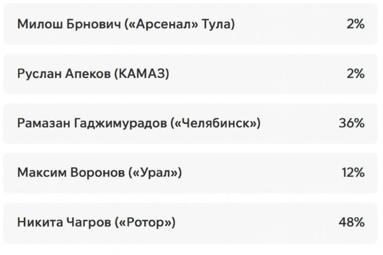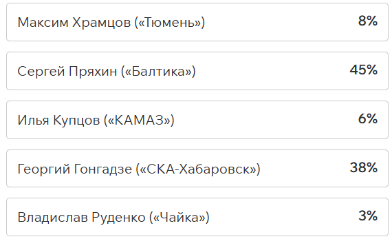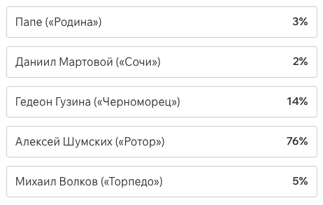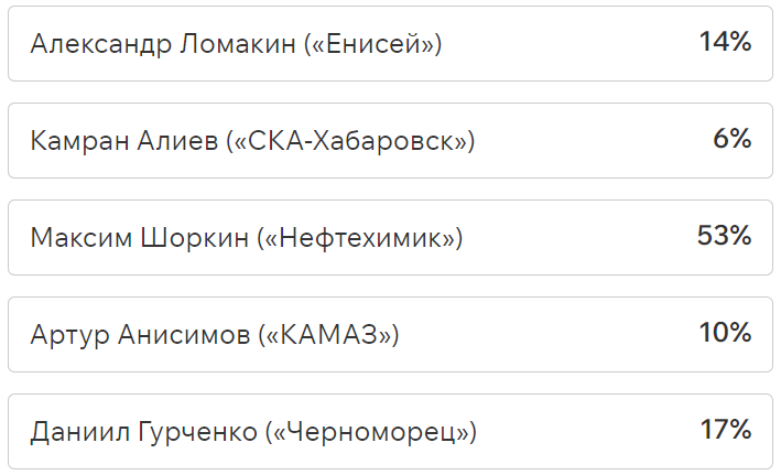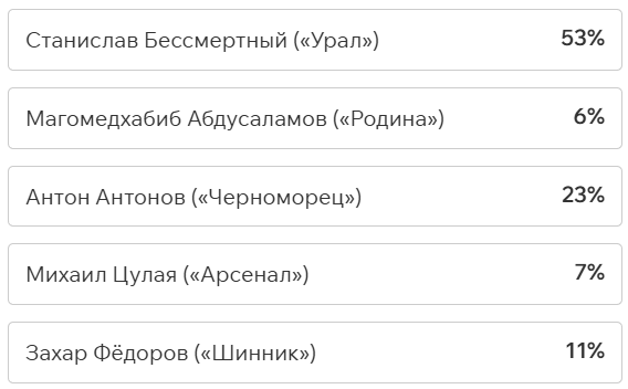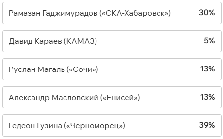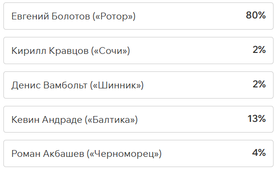 Игроки и тренеры команд ФНЛ подарили каждому кандидату по одному голосу (всего их 36, одна из команд отказалась от участия в голосовании). Мартин Крамарич получил 15 голосов, Кевин Андраде («Балтика») — 10, Роман Акбашев («Черноморец») — 9.