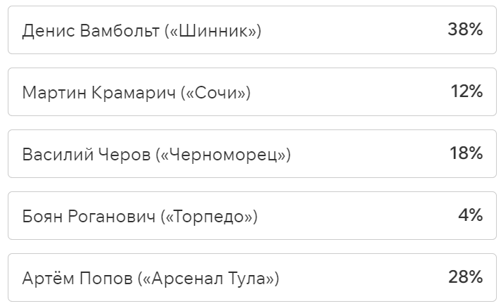 Ещё один герой матча «Родина» — «Торпедо» (3:0) — вратарь хозяев Сергей Волков. Голкипер отбил четыре удара соперника и совершил два сейва, заработав в свою статистику заслуженный «сухарь».