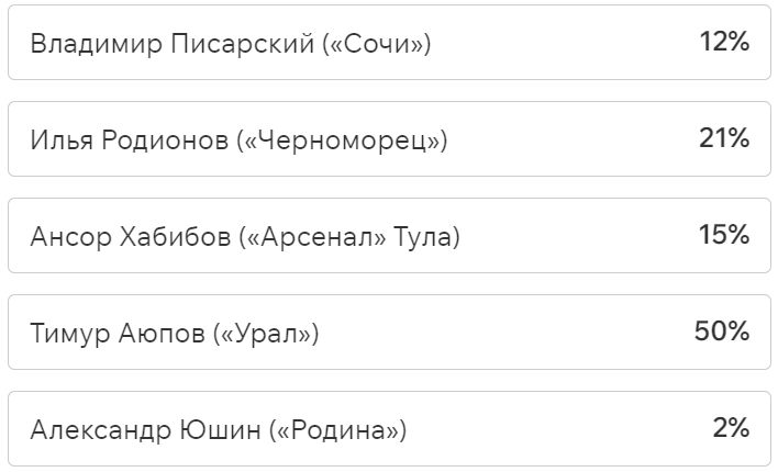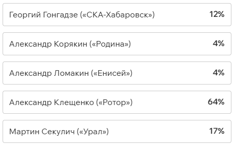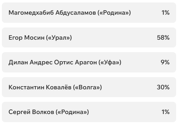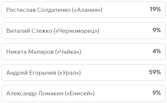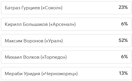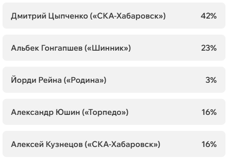 На этот раз наше голосование обойдётся без футболистов «СКА-Хабаровск», потому что они пали от ног Артура Мурзы из «Волги» (1:0). У левого вингера всего три успешные обводки из девяти, ноль удачных навесов из пяти и 20% выигранных единоборств. Но Артур мог позволить себе всё что угодно, ведь он забил победную красоту на четвёртой минуте: сместился в центр и прицельным ударом метров с 25 положил мяч в дальний угол.