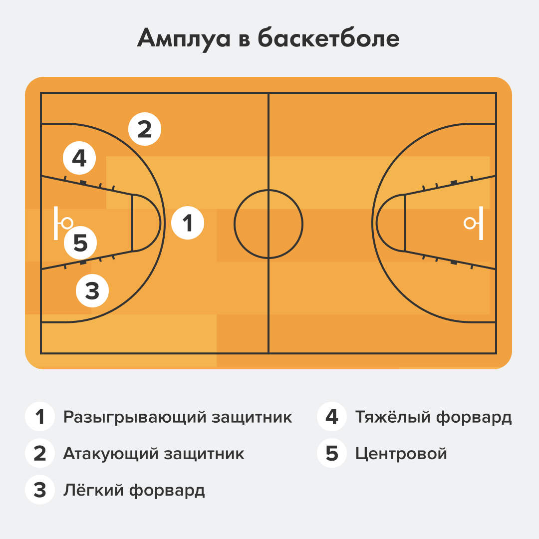 В баскетболе, как и в хоккее, позиций на площадке немного — обычно выделяют всего пять игровых амплуа: атакующий и разыгрывающий защитники, лёгкий и тяжёлый форварды, а также центровой.