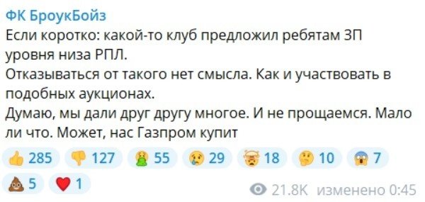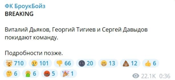 Летом 2022 года в тг-канале «Броуков» появился пост о том, что лидеры команды в лице Тигиева, Давыдова и Дьякова её покидают. А ведь именно эти футболисты делали результат как на футбольном поле, так и вне его.
