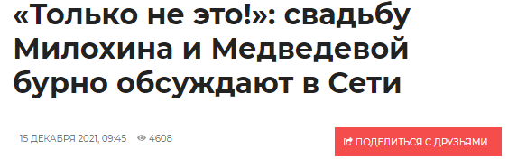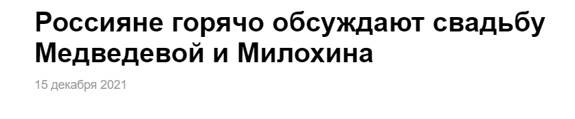 Подобную ситуацию вы могли наблюдать и с бесконечными заголовками о свадьбе М&М. Породил их самый спорный и обсуждаемый момент прошедшего сезона «Ледникового периода» — поцелуй Милохина и Медведевой во время проката.