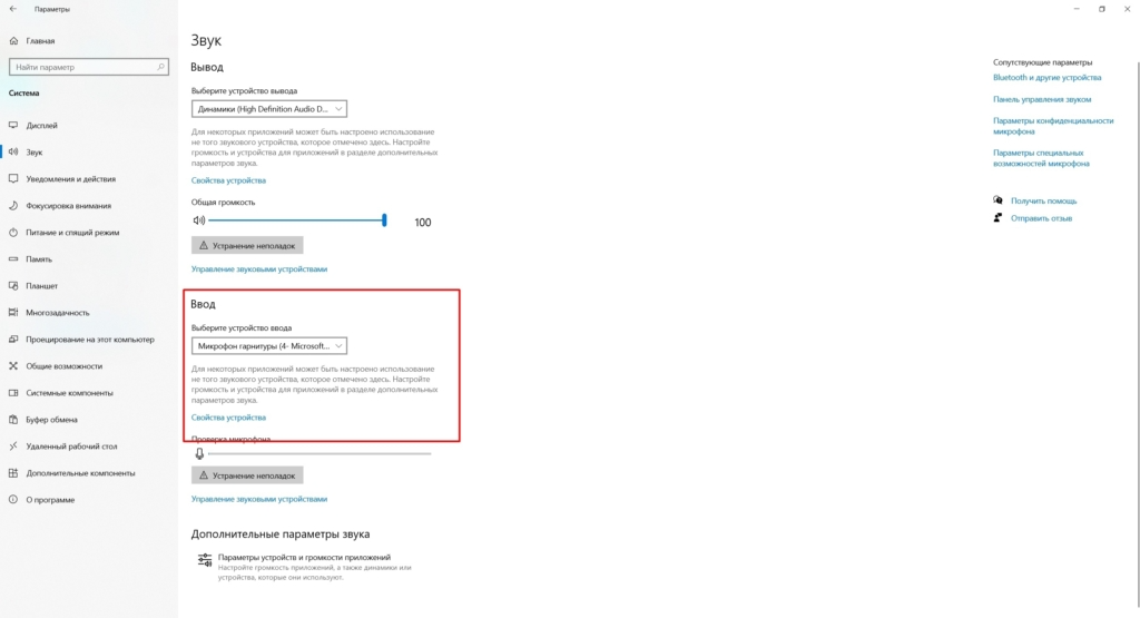 Чтобы правильно настроить микрофон в Windows, перейдите в «Настройки» в меню «Пуск», затем в меню «Система» и откройте вкладку «Звук». Выберите устройством ввода необходимый микрофон.