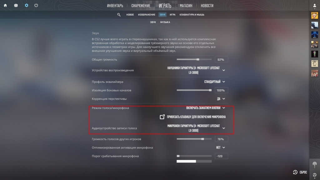 Чтобы правильно установить микрофон в Counter-Strike, в «Настройках» найдите вкладку «Звук», после чего в строке «Аудиоустройство записи голоса» выберите свой микрофон. Здесь же кликните на «Привязать клавишу для включения микрофона» и выберите нужную.