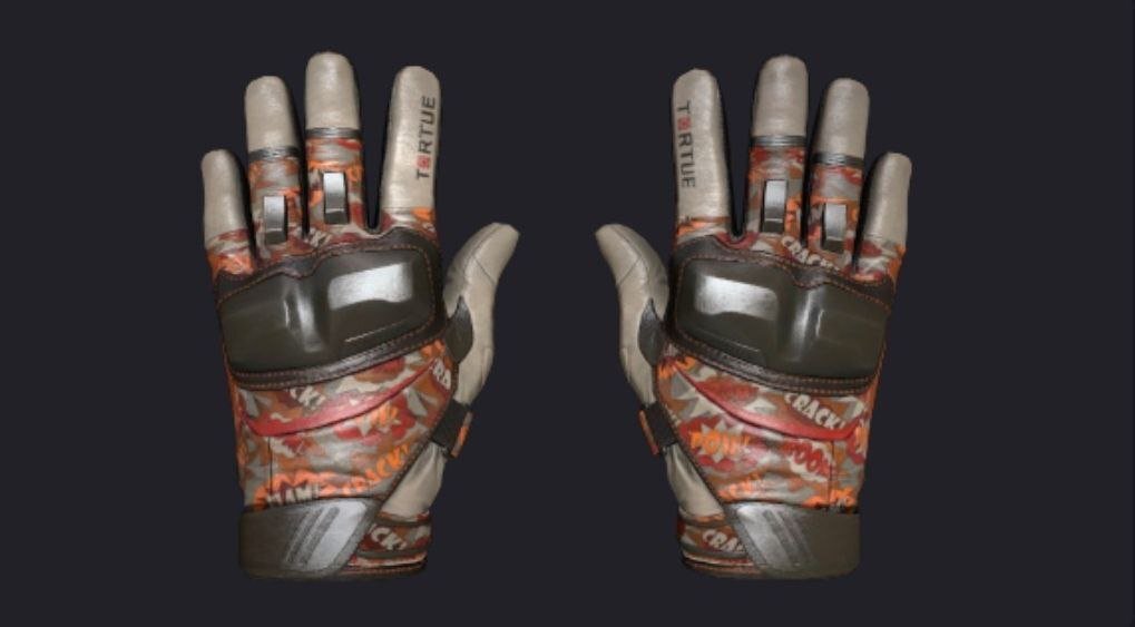 Добавление мотоциклетных перчаток Moto Gloves | POW! произошло в феврале 2018 года с кейсом «Решающий момент». Они изготовлены из белой кожи и украшены красно-оранжевым паттерном в виде надписей BOOM!, CRACK!, BLAM! и POW!. Цена около 10 500 за низкое качество и 168 000 рублей за перчатки «Прямо с завода».