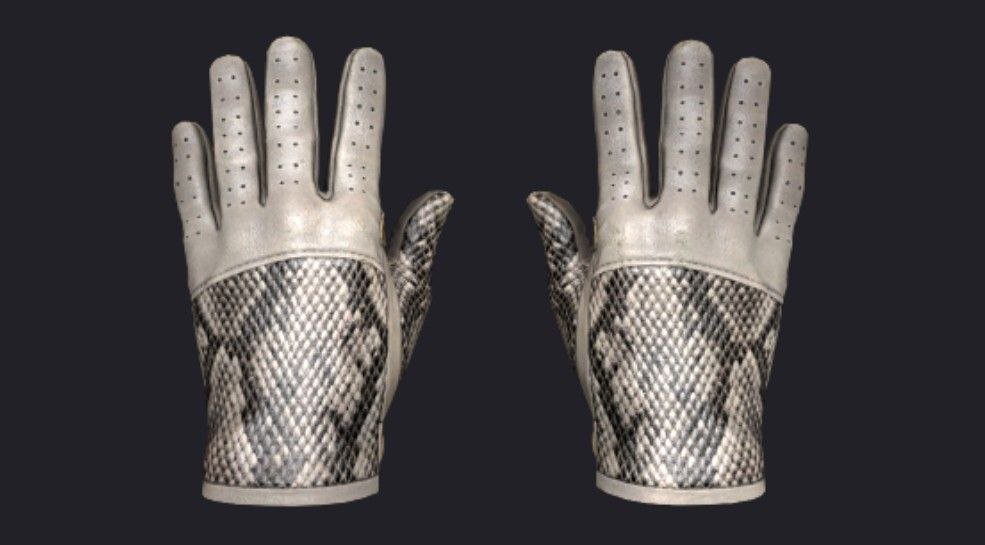 Driver Gloves | King Snake — водительские перчатки из бело-серой змеиной кожи. Доступны в контейнерах Clutch Case или Revolution Case. Цена за состояние «Закалённые в боях» начинается от 21 000 рублей.