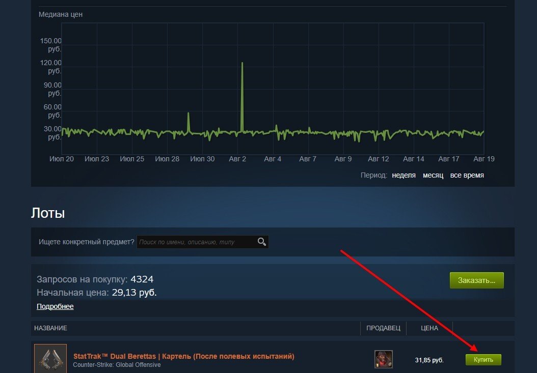 Перед покупкой предмета можно ознакомиться с графиком цен. Если вы считаете, что скин продается по завышенному курсу, нажмите кнопку «Заказать» и установите сумму, которую готовы потратить. Как только на рынке появится предмет с идентичной или меньшей ценой, система автоматически выкупит его для вас. После покупки скин будет красоваться в разделе «Инвентарь».