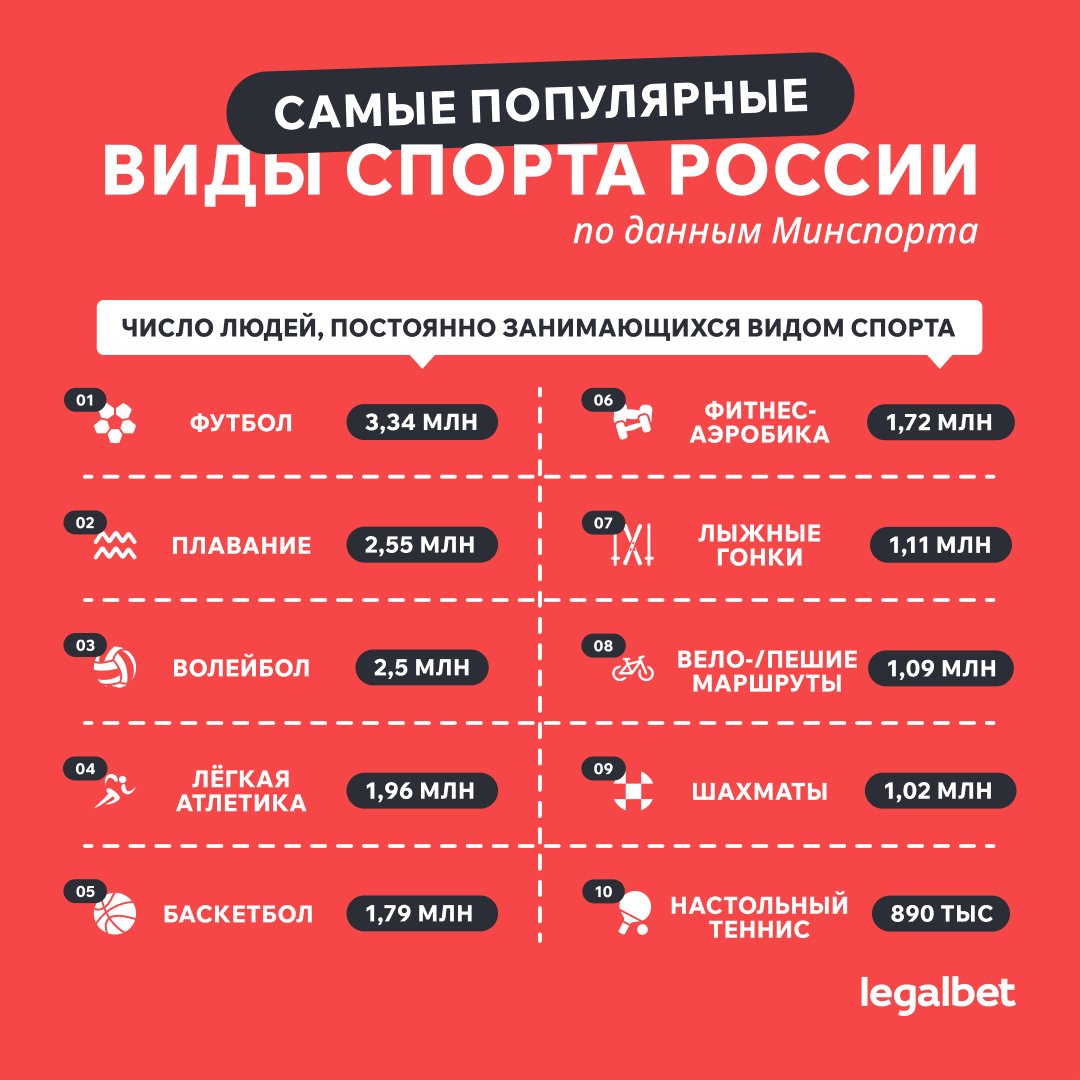 Лидирующую строчку в списке самых популярных видов спорта в России 2023, конечно же, занимает футбол. И это настолько ожидаемо и предсказуемо, что давать комментарии на этот счёт — значит, снова и снова повторяться. Сыграть в футбол гораздо проще, чем в хоккей. Профессиональным атлетом можно быть как с ростом 170, так и 190+ — в этом плане он более доступен, чем баскетбол и волейбол. И так далее, и так далее.